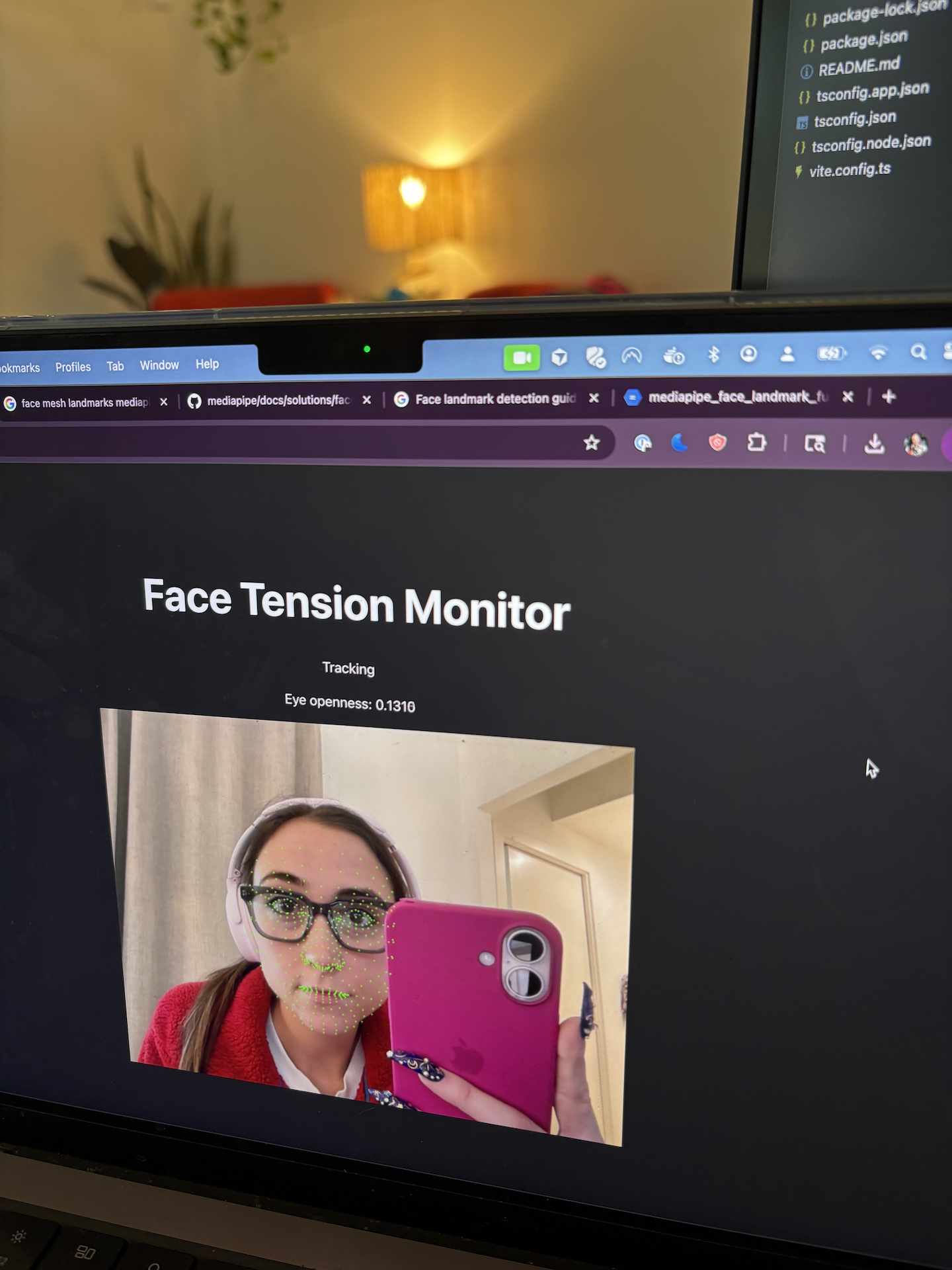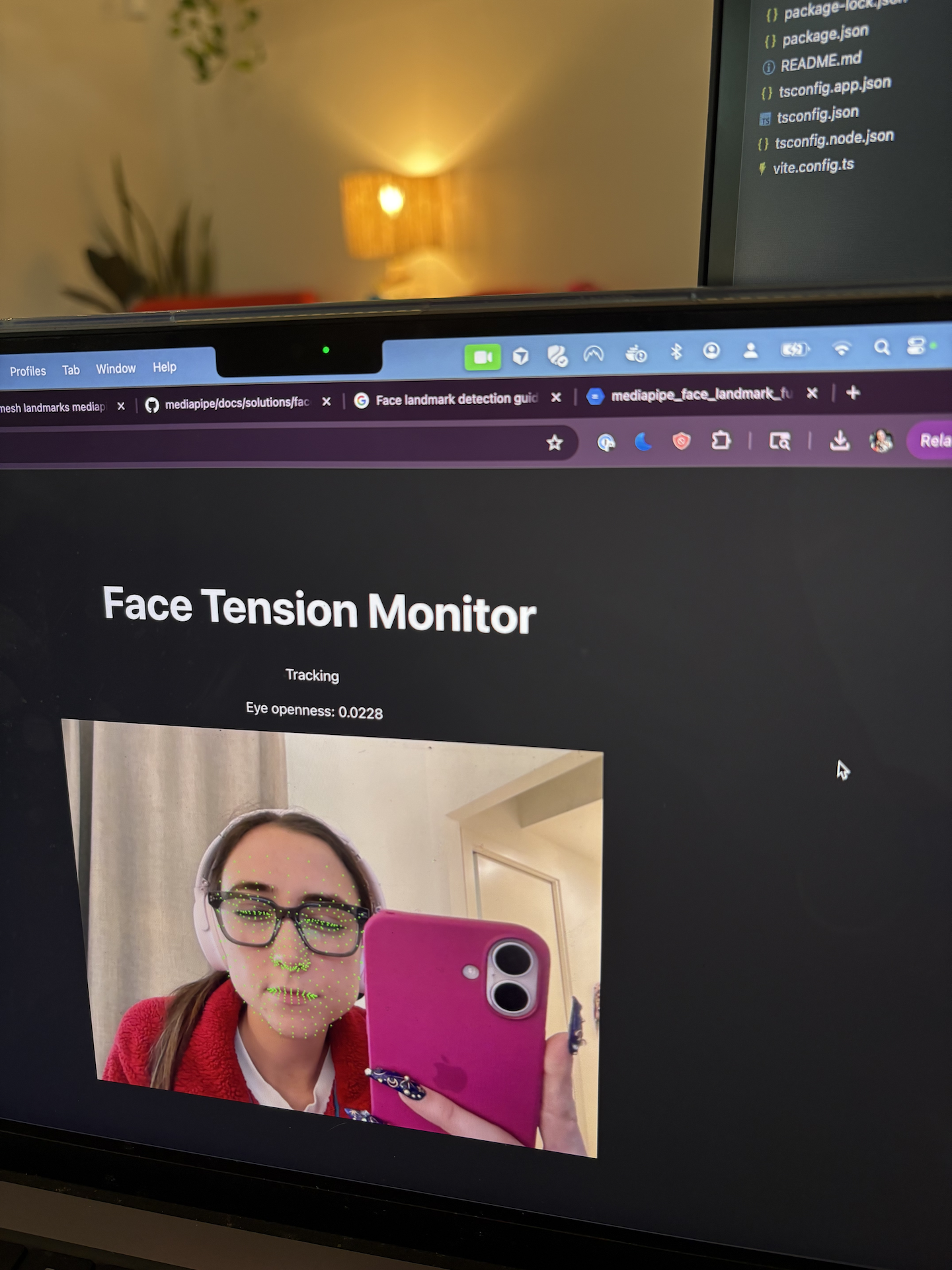After some research, I landed on Google’s MediaPipe Tasks Vision library. MediaPipe is a cross-platform framework for building perception pipelines, and its Face Landmarker solution detects 478 facial landmarks in real time, which is exactly what I needed to start tracking facial tension.